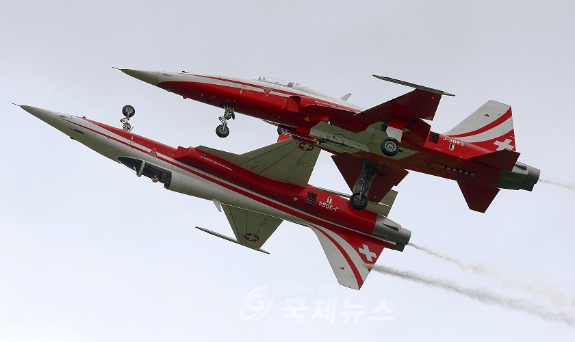 Members of the Patrouille Suisse flight team of the Swiss Air Force perform in their Northrop F-5 ll Tiger fighting jets during a media day of the Swiss Air Force at the airbase in the central Swiss town of Emmen April 17, 2015. REUTERS/Arnd Wiegmann