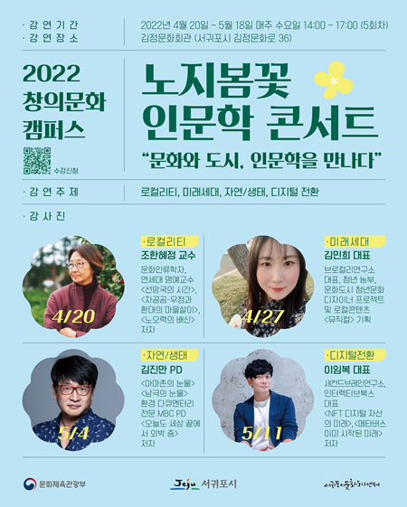 (제주=국제뉴스) 문서현 기자 =서귀포시(시장 김태엽)와 서귀포시문화도시센터(센터장 이광준)는 2022년 창의문화캠퍼스 노지문화 봄꽃 학기 인문학 콘서트를 개최한다.