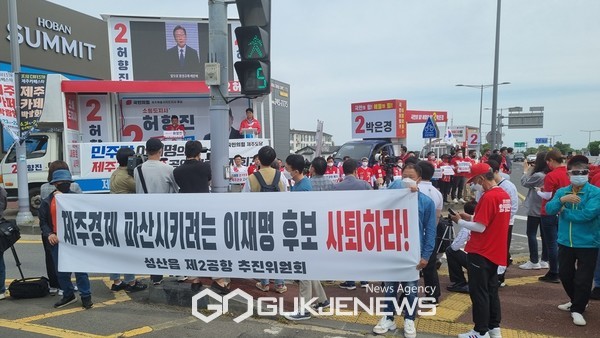 국민의힘 허향진 제주도지사 후보는 이에 대해 강력하게 반발하며 이재명 김포공항 이전 공약을 규탄했다.