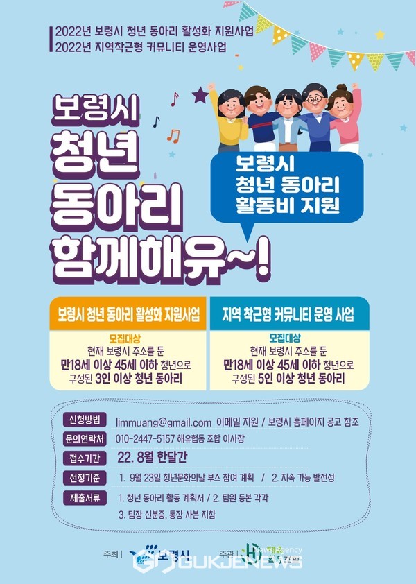 신청 자격은 보령시에 주소를 둔 만 18세 이상 만 45세 이하의 청년들로 구성된 동아리이며 오는 31일까지 신청서 및 활동계획서 등 제출서류를 전자메일로 접수하면 된다.