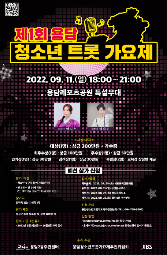제1회 용담 청소년 트로트 가요제는 오는 9월11일 토요일 오후6시 용담레포츠공원 특설무대에서 진행되며, 제주도내 거주하는 청소년(9세이상 24세 이하)이면 누구나 참여가 가능하다.