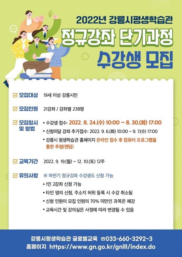 (강릉=국제뉴스) 장덕진 기자 = 강릉시 평생학습관에서는 2022년 정규강좌 단기과정 수강생을 24일부터 30일까지 모집한다.