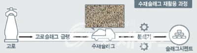 고로 부산물 중 하나인 슬래그(slag)는 처리방법에 따라 수재슬래그와 괴재슬래그로 나뉘는데, 수재슬래그는 고압의 물을 분사해 급랭시킨 뒤 알갱이 형태로 처리하는 것으로 주로 시멘트 등의 원료로 사용된다.