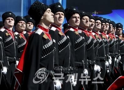 (러시아/로이터) 정영선 기자 = 7일 (현지시각) 승전 기념일을 앞두고 모스크바 붉은 광장에서 카자크 대원들이 옛 군복을 입고 행사 예행 연습을 하고 있다. 5월 9일은 러시아의 독일 나치에 대한 승전기념일이다.