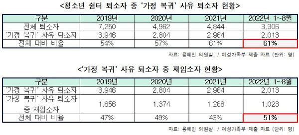 용혜인 의원은 “실무자의 자의적 판단에 의해 아동청소년의 가정 복귀가 결정되고 있다”며 “가정 회복의 정도를 면밀히 파악할 수 있는 요건 마련이 절실하다”고 말했다. 용혜인의원실이 여성가족부에 제출받은 자료에 따르면, 쉼터 퇴소 청소년 61%가 ‘가정 복귀’를 사유로 퇴소한다. 그러나 ‘가정 복귀’를 사유로 퇴소한 청소년 중 절반 이상이 쉼터 재입소를 결정해, 가정 복귀 결정 요건과 복귀 이후의 모니터링이 미흡하다는 지적이 나온다.