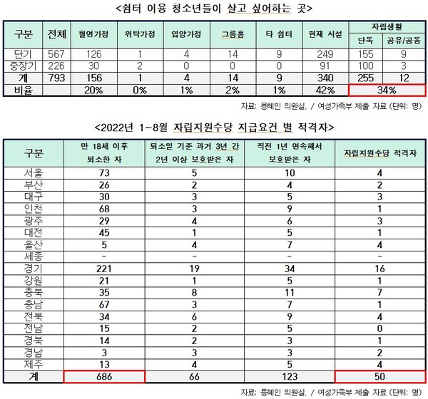 이어서 용혜인 의원은 “자립지원 역시 필요하다”고 강조했다. 용혜인의원실이 여성가족부에 제출받은 자료에 따르면, 2022년 9월 기준 쉼터 거주 청소년의 34%가 자립생활을 희망했다. 그러나 여성가족부의 자립지원정책은 대부분 만 18세 이후 퇴소자만을 대상으로 하고 있어 아동청소년기의 자립을 지원할 수 없다. 또한 퇴소일 기준 과거 3년 간 2년 이상 보호받은 자 등 까다로운 요건을 가지고 있어 가정 밖 청소년이 이용하기 어렵다는 지적이 나온다.