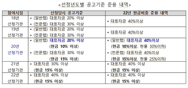 양이원영 의원이 창업진흥원으로부터 제공받은 자료에 따르면, 창업진흥원은 지난 1월 10일 협약체결 안내 공문을 발송하고, 11일 온라인 협약설명회를 개최한 것으로 나타났다. 선정 년도별 공고기준 및 준용내용을 살펴보면, 20년 대응자금 20%로 사업에 참여한 기업은 ’22년 대응자금 40% 이상으로 적용된 것으로 나타났다.