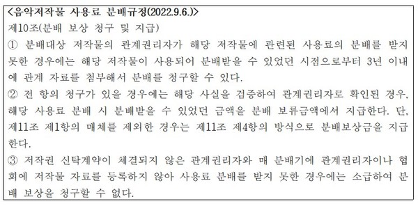 특히, 음악저작물 사용료 분배규정에 제10조 1항에 따르면 3년이 지나면 저작권료를 청구할 수 없다. 또한 3항에 따르면 협회에 등록하지 않은 저작권자는 소급하여 분배 보상을 청구할 수 없도록 규정하고 있어 불합리한 것으로 나타났다.
