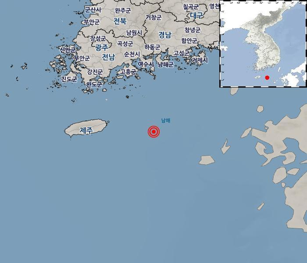 (서울/국제뉴스) 송서현 기자 = 기상청은 "11월 8일 0시 45분 45초경 전남 여수시 거문도 남남동쪽 92km 해역에서 2.1(± 0.2) 규모의 지진이 발생했다"고 밝혔다.