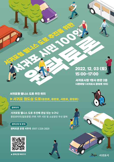 서귀포시(시장 이종우)는 오는 12월 3일(토) 15시 서귀포형 웰니스 도로 기본구상을 위한 서귀포 시민 100인 원탁 토론을 1청사 본관 2층 너른마당에서 개최한다.