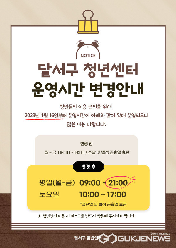 달서구 청년센터(중흥로 3)는 평일 9시~18시까지 운영해 왔으나 청년라이프 스타일에 맞춰 운영시간을 이달 16일부터 평일(월~금) 9시~21시, 토요일 10시~17시로 야간·토요일까지 확대할 예정이다.