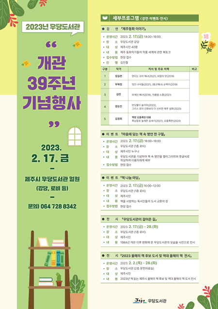 이에 제주시 우당도서관(관장 강봉수)은 오는 17일, 개관 39주년 기념 행사를 개최한다고 7일 밝혔다.