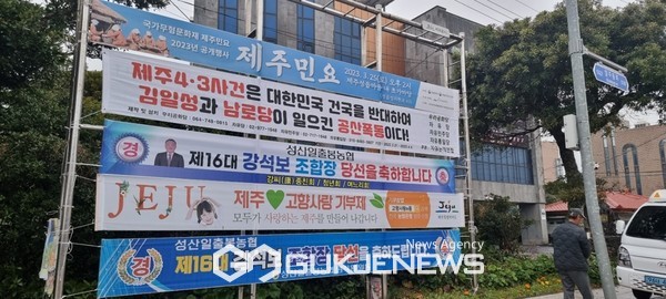 지난 21일부터 제주시와 서귀포시내 일대 60여곳에 ‘제주4·3사건은 대한민국 건국을 반대하며 김일성과 남로당이 일으킨 공산폭동이다’라는 현수막들이 걸렸다.