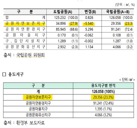 ▲제138차 국립공원위원회 심의안건(위)에는 팔공산도립공원이 국립공원으로 승격되면서 공원자연보존지구가 4.6% 줄어든다는 내용이 들어있지만, 환경부 보도자료(아래)에는 확정된 용도지구별 면적만 나와 있다.