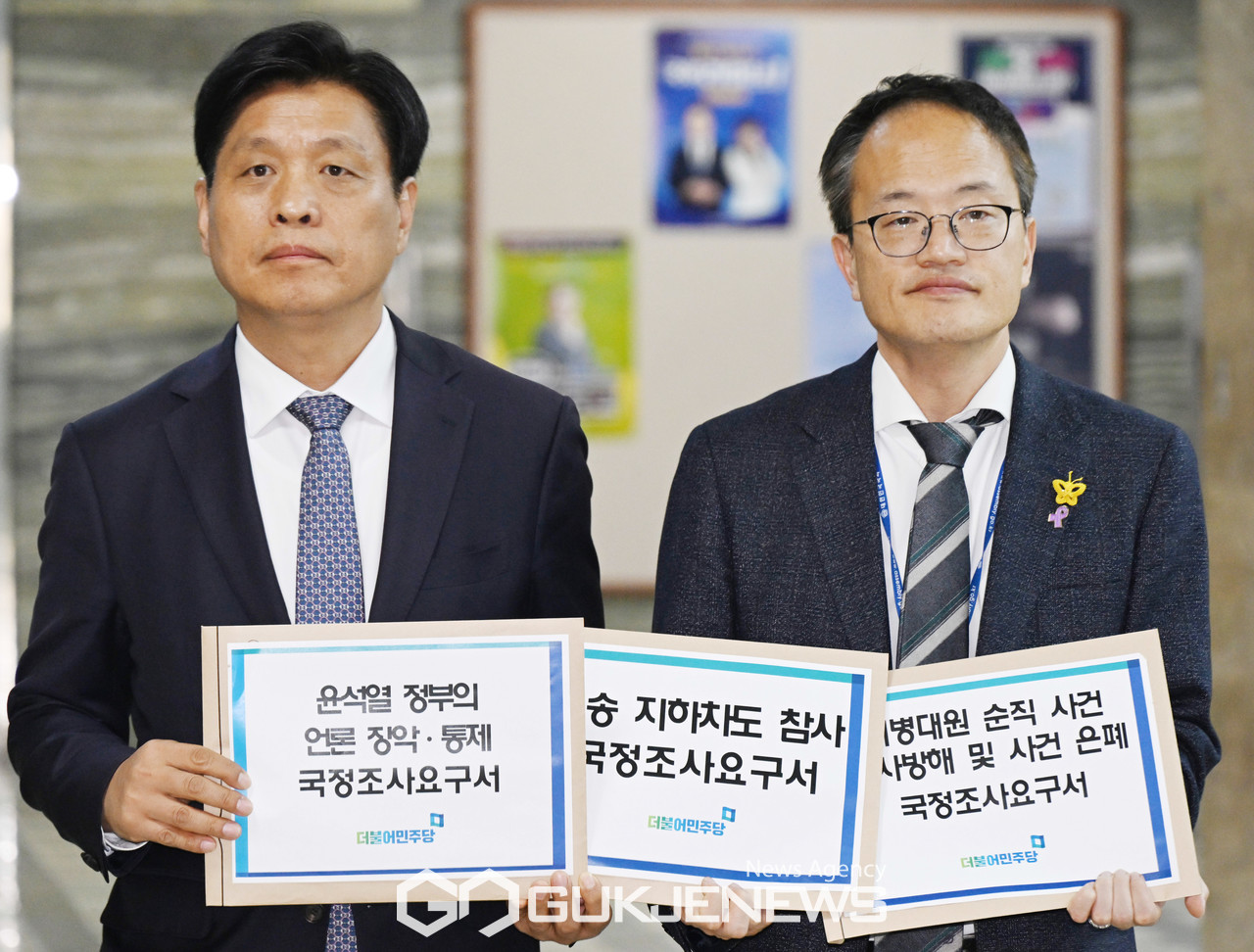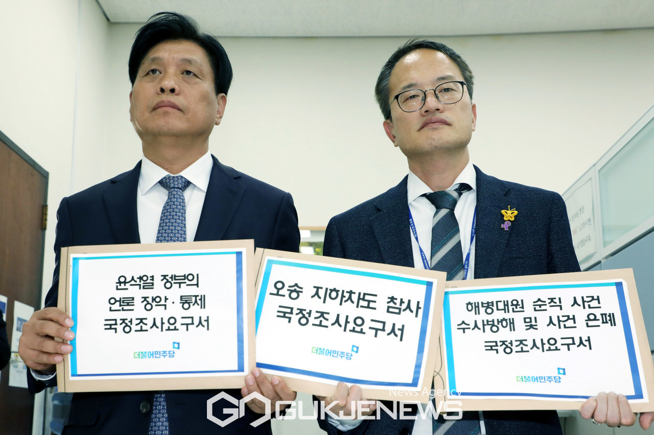 (서울=국제뉴스) 더불어민주당 박주민(오른쪽), 조승래 의원이 8일 오후 서울 여의도 국회 의안과에서 순직해병 수사방해 및 사건은폐 진상규명, 오송 지하차도 참사 진상규명, 윤석열정부 방송장악 진상규명 국정조사요구서를 접수하고 있다./사진=이용우기자