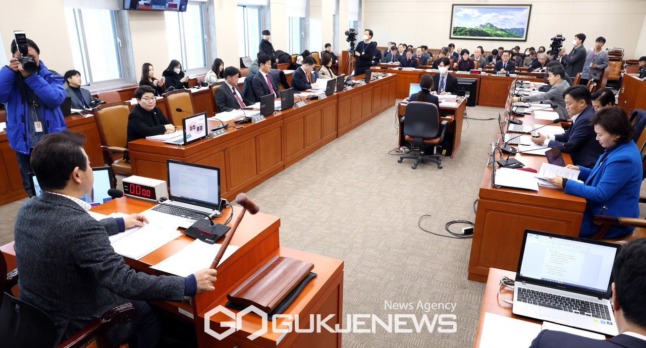 (서울=국제뉴스) 박정 국회 환경노동위원장이 22일 오전 서울 여의도 국회에서 열린 전체회의에서 안건을 상정하며 의사봉을 두드리고 있다./사진=이용우기자