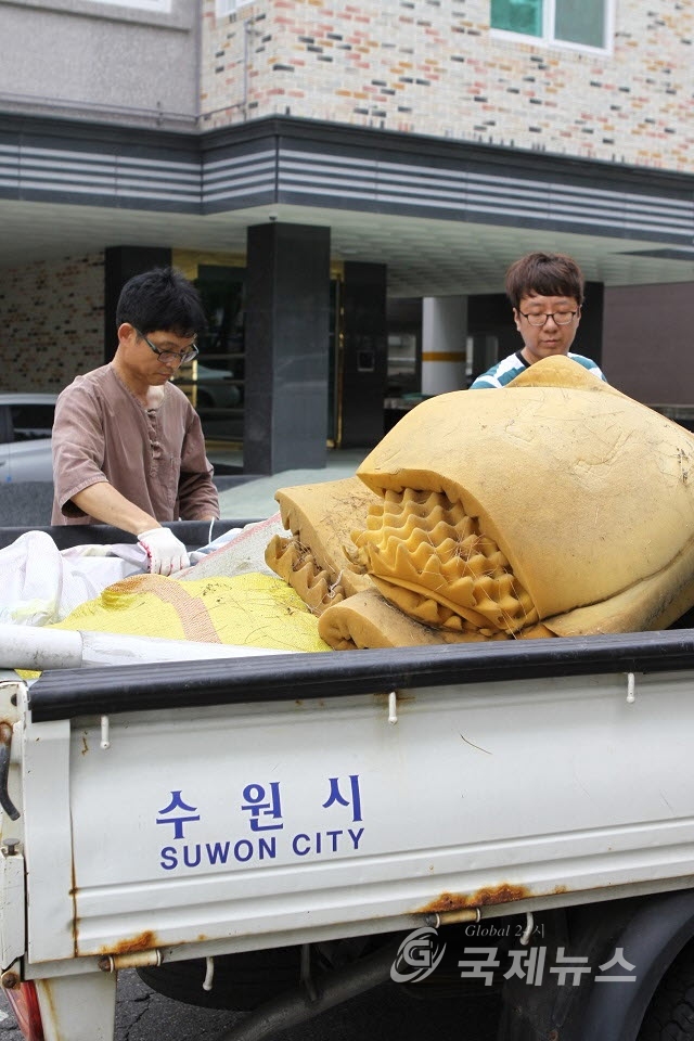 ▲ 25일 오후 수원시 장안구 정자3동주민자치위원회, 통장협의회 회원, 동주민센터 직원들이 국토대청소를 펼친 가운데 천천동의 한 주택가 화단에서 수거된 오물들이 차량에 적재되고 있다.(사진=국제뉴스 유성열 기자)