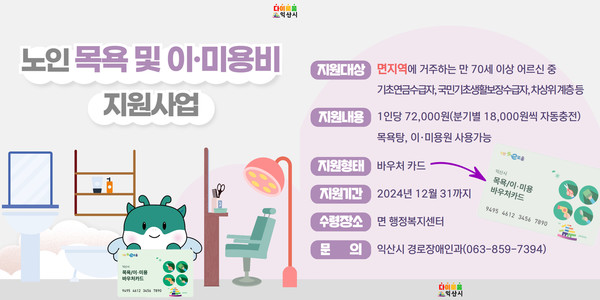 시는 노인 목욕비 지원 사업에 이·미용업소를 추가하고, 지난해까지 지류로 제공되던 목욕탕 이용권을 카드 형태로 변경해 지급한다고 9일 밝혔다.