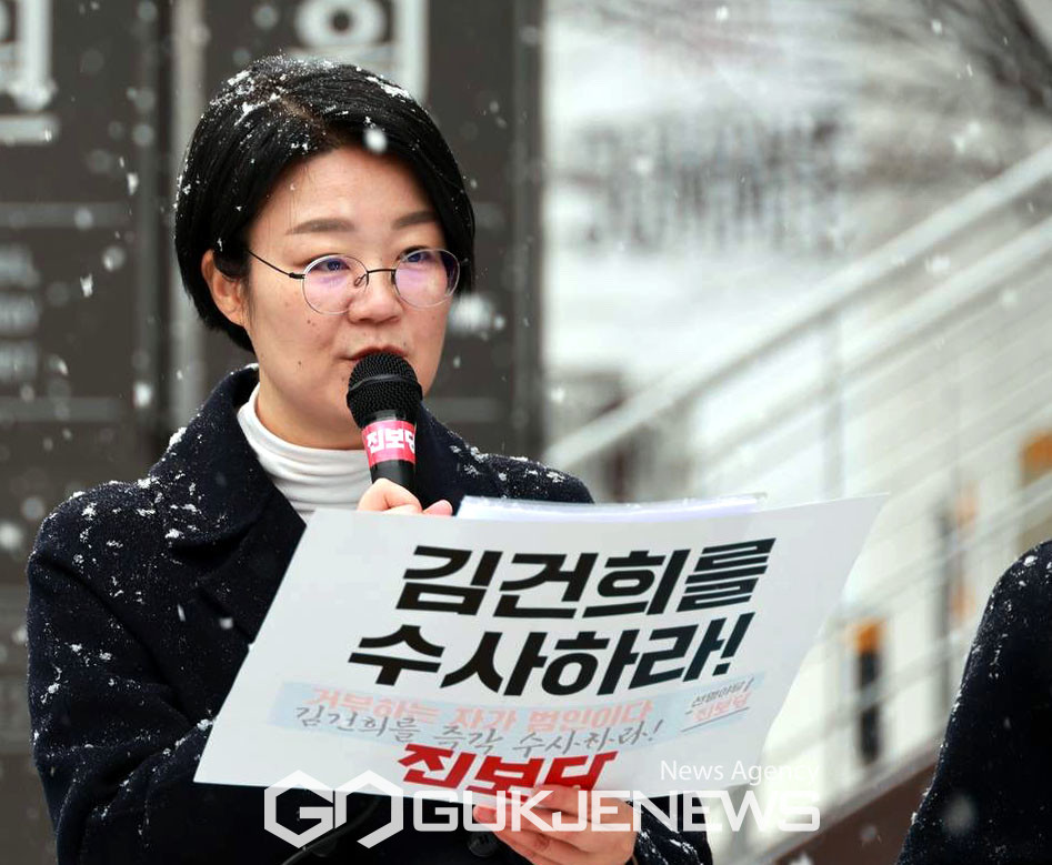 (서울=국제뉴스) 진보당 윤희숙 상임대표가 17일 오전 서울행정법원 앞에서 표현의자유 침해,위헌.위법적인 '김건희 수사' 현수막 강제철거 취소 소송 기자회견을 하고 있다./사진=이용우기자
