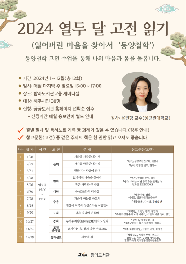 (제주=국제뉴스) 문서현 기자 = 탐라도서관은 2024년 한 해 동안 <잃어버린 마음을 찾아서 ‘동양철학‘>을 주제로 ‘열두 달 고전 읽기’ 프로그램을 운영한다.