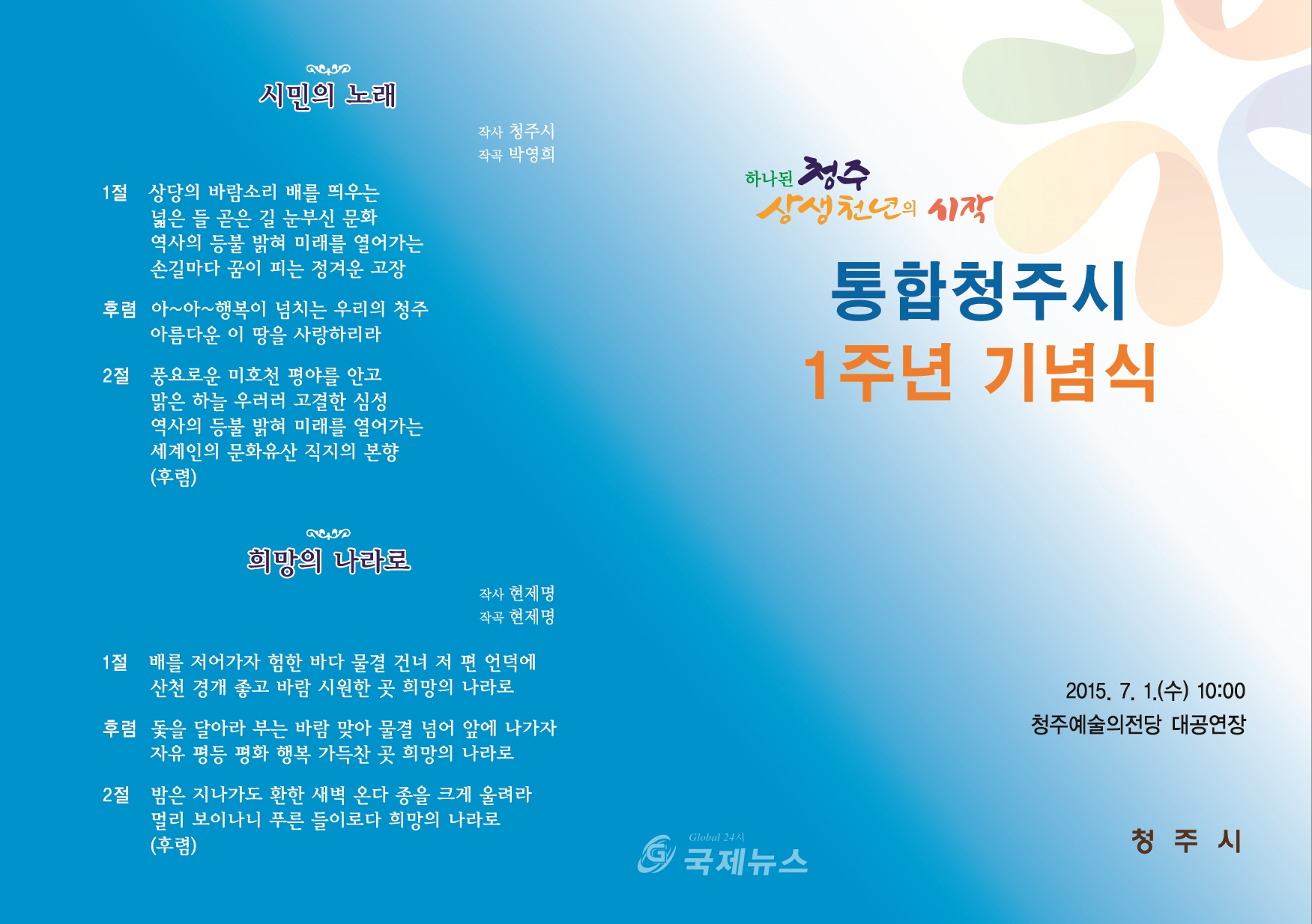 (청주시=국제뉴스) 남윤모 기자 = 충북 청주시는 내달 1일 오전 10시 청주예술의 전당 대 공연장에서 통합 청주시 1주년 기념식을 갖는다.