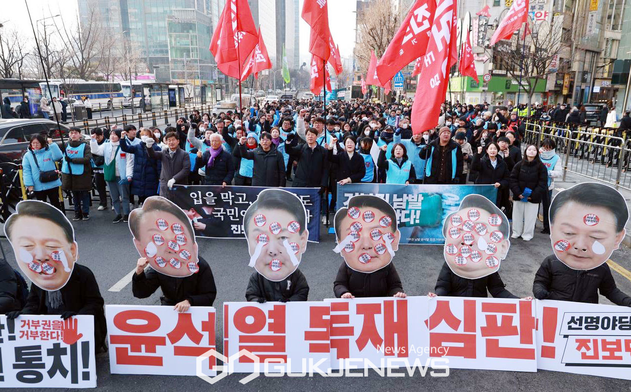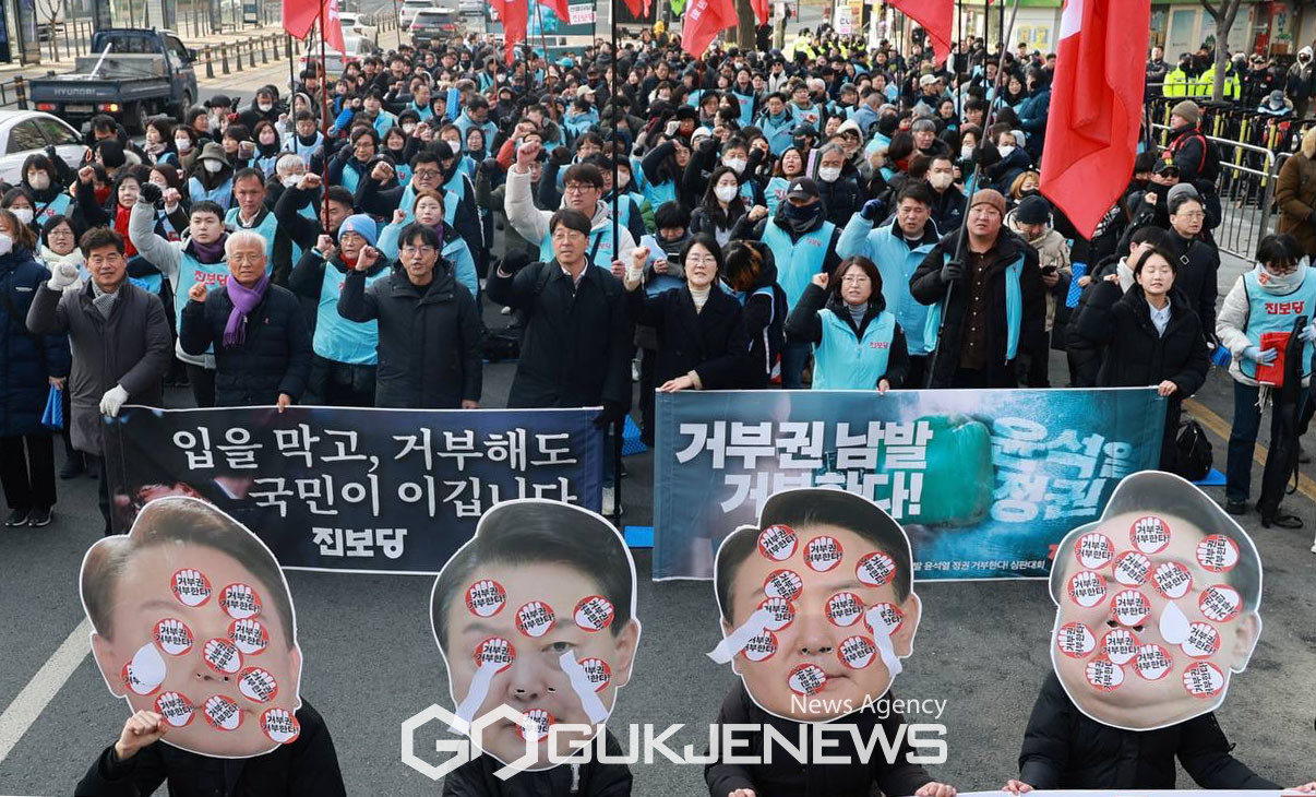 (서울=국제뉴스) 진보당 윤희숙 상임대표등 당원들이 27일 오후 광화문에서 열린 거부권 정치,공포정치,윤석열 독재 심판! 민주주의 수호! 진보당 정당연설회에서 구호를 외치고 있다./사진=이용우기자
