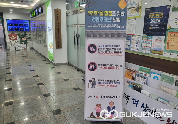 군은 청사 곳곳에 입간판을 세우고 공직자 내부 전산망인 새올행정시스템으로 ‘설 청렴주의보’ 발령을 홍보하고 있다.