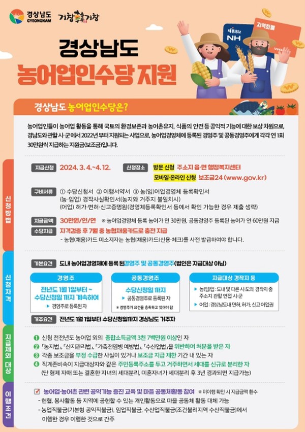2023년 1월 1일부터 수당 신청일까지 경상남도에 계속하여 주소를 두고, 농어업경영체에 등록한 농어가면 신청이 가능하다.