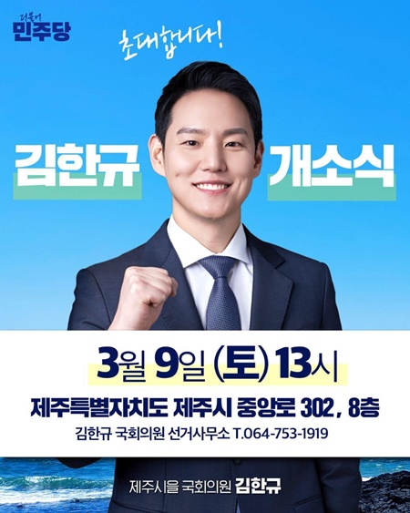 (제주=국제뉴스) 문서현 기자 = 제22대 총선에서 재선에 도전하는 김한규 국회의원 후보(더불어민주당, 제주시을)이 9일 오후 1시 제주시 중앙로 302(더 스프링빌딩) 앞에서 현판식을 열고 해당 건물 8층에 소재한 선거사무소에서 개소식을 열고 총선 승리를 향한 본격적인 행보에 나선다.