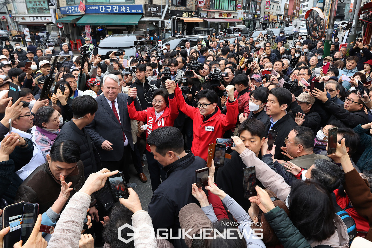 (서울=국제뉴스) 한동훈 국민의힘 총괄선대위원장이 25일 서울 중구 신당동 떡볶이 타운을 찾아 이혜훈 중구성동구을 국회의원 후보와 함께 지지를 호소하고 있다./사진=이용우기자