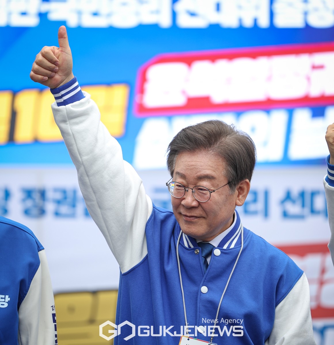 (서울=국제뉴스) 이재명 더불어민주당 대표가 4.10 총선 공식 선거운동 첫날인 28일 서울 용산구 용산역 광장에서 열린 정권심판·국민승리 선대위 출정식에서 시민들에게 인사를 하고 있다. /사진=원명국 기자