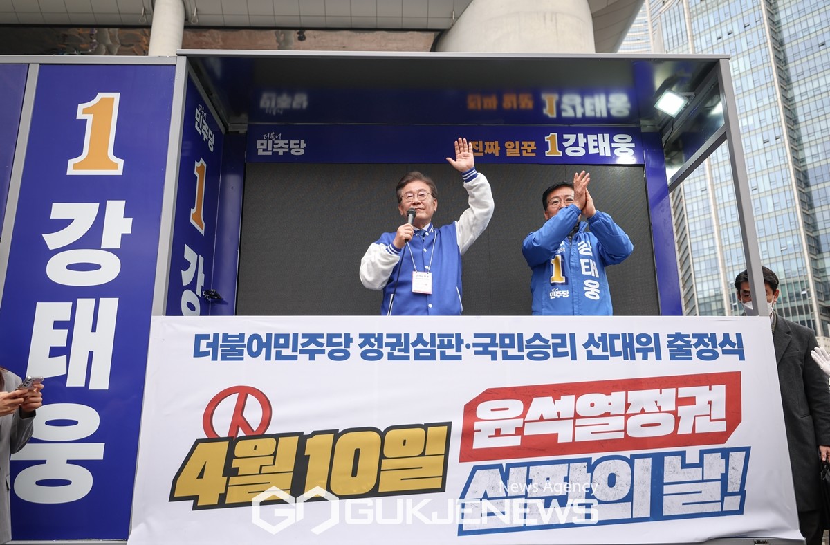 (서울=국제뉴스) 이재명 더불어민주당 대표가 4.10 총선 공식 선거운동 첫날인 28일 서울 용산구 용산역 광장에서 열린 정권심판·국민승리 선대위 출정식에서 강태웅 후보와 손을 잡고 지지를 호소하고 있다. /사진=원명국 기자