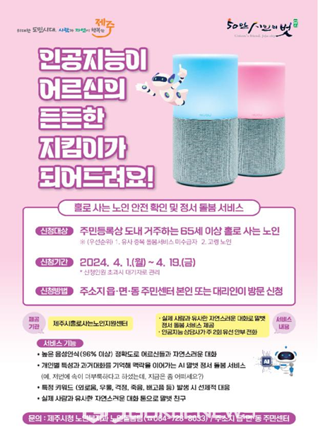 (제주=국제뉴스) 문서현 기자 =제주시는 노인들의 삶의 질 향상과 돌봄의 효율성을 고려해 인공지능 기기를 활용한 스마트 노인돌봄 서비스 사업을 올해 4월부터 시행한다.