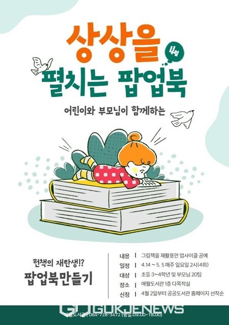 (제주=국제뉴스) 문서현 기자 =애월도서관은 가족 모두가 주말이나 여가시간을 도서관에서 즐겁게 보낼 수 있도록 하기 위한 어린이&학부모 프로그램 ‘상상을 펼치는 팝업북’참여자를 모집한다.