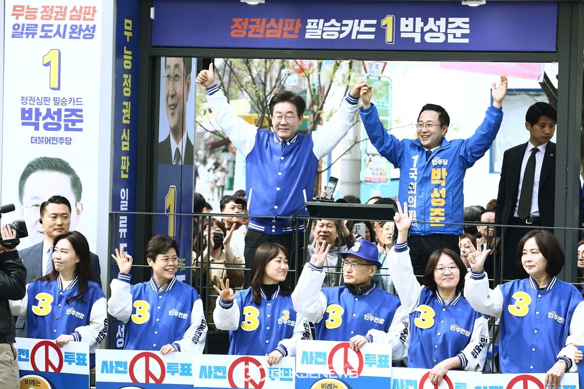 (서울=국제뉴스) 이재명 더불어민주당 대표가 6일 서울 성동구 금남시장 인근에서 박성준 중구성동구을 후보 지지유세를 하고 있다. /사진=원명국 기자
