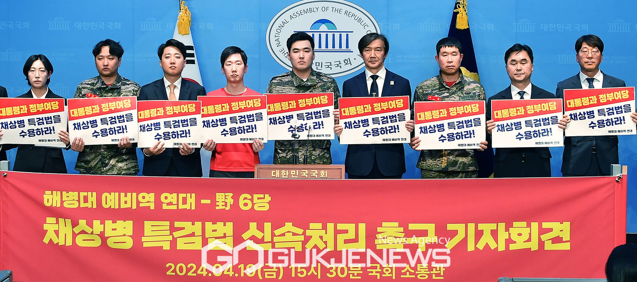 (서울=국제뉴스) 정원철 해병대예비역연대 회장과 야6당 지도부가 19일 서울 여의도 국회 소통관에서 열린 '야6당-해병대예비역연대,채상병 특검법 신속 처리 촉구 기자회견'에서 손피켓을 들고 특검법 처리 촉구를 하고 있다. 이날 기자회견에는 전재수, 박주민 더불어민주당 의원과, 조국 조국혁신당 대표, 이준석 개혁신당 대표, 장혜영 녹색정의당 원내대표 직무대행, 강성희 진보당 원내대표, 김종민 새로운미래 의원 등이 참석했다./사진=이용우 기자