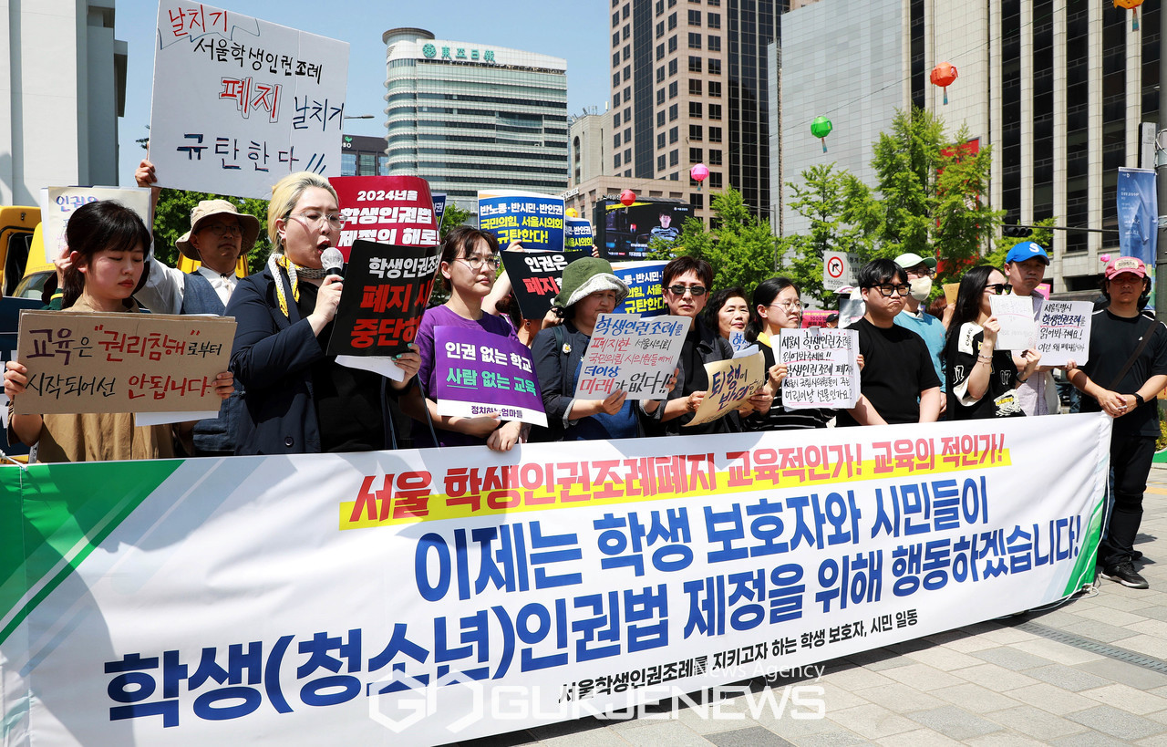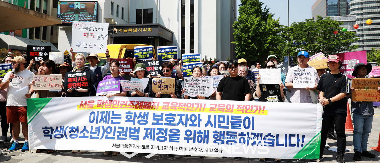 (서울=국제뉴스) 서울학생인권조례를 지키고자 하는 학생 보호자 일동 회원들이 3일 오후 서울 중구 서울시의회 앞에서 서울 학생 인권조례 폐지 반대 기자회견을 하고 있다./사진=이용우기자
