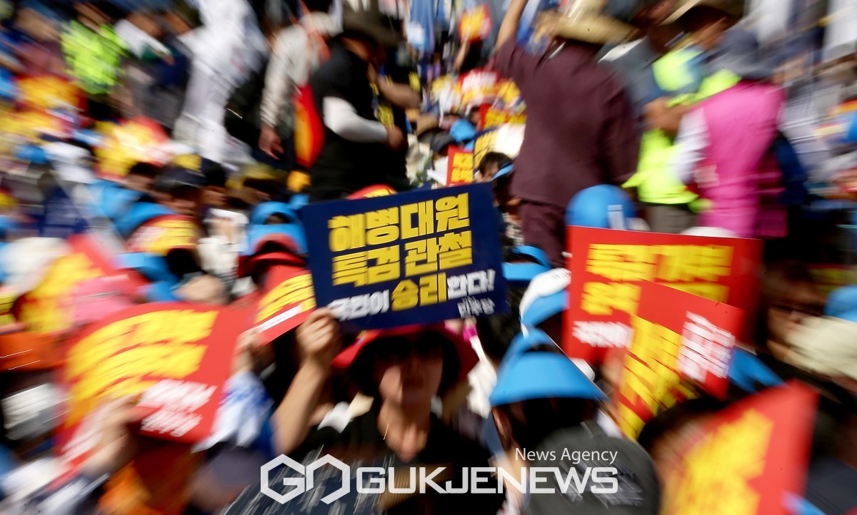 (서울=국제뉴스)1일 서울 용산구 서울역 인근에서 열린 윤석열정권 규탄 및 해병대원 특검법 관철을 위한 범국민대회에서 참석자들이 피켓을 들고 구호를 외치고 있다. /사진=원명국 기자