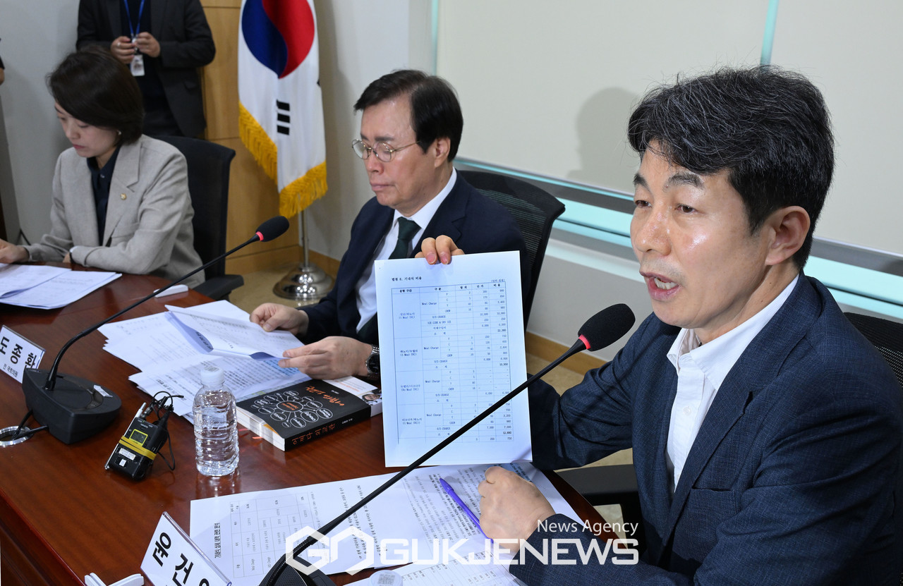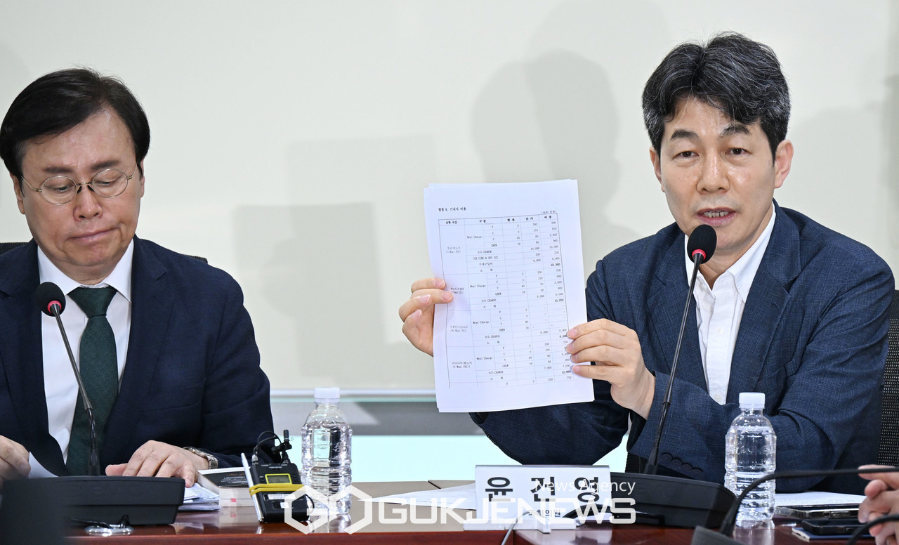 (서울=국제뉴스) 윤건영 더불어민주당 의원이 7일 오전 서울 여의도 국회 의원회관에서 열린 김정숙 여사 인도 방문 관련 당시 대표단장 기자간담회에서 기내식 상세내역표를 들어보이고 있다./사진=이용우기자
