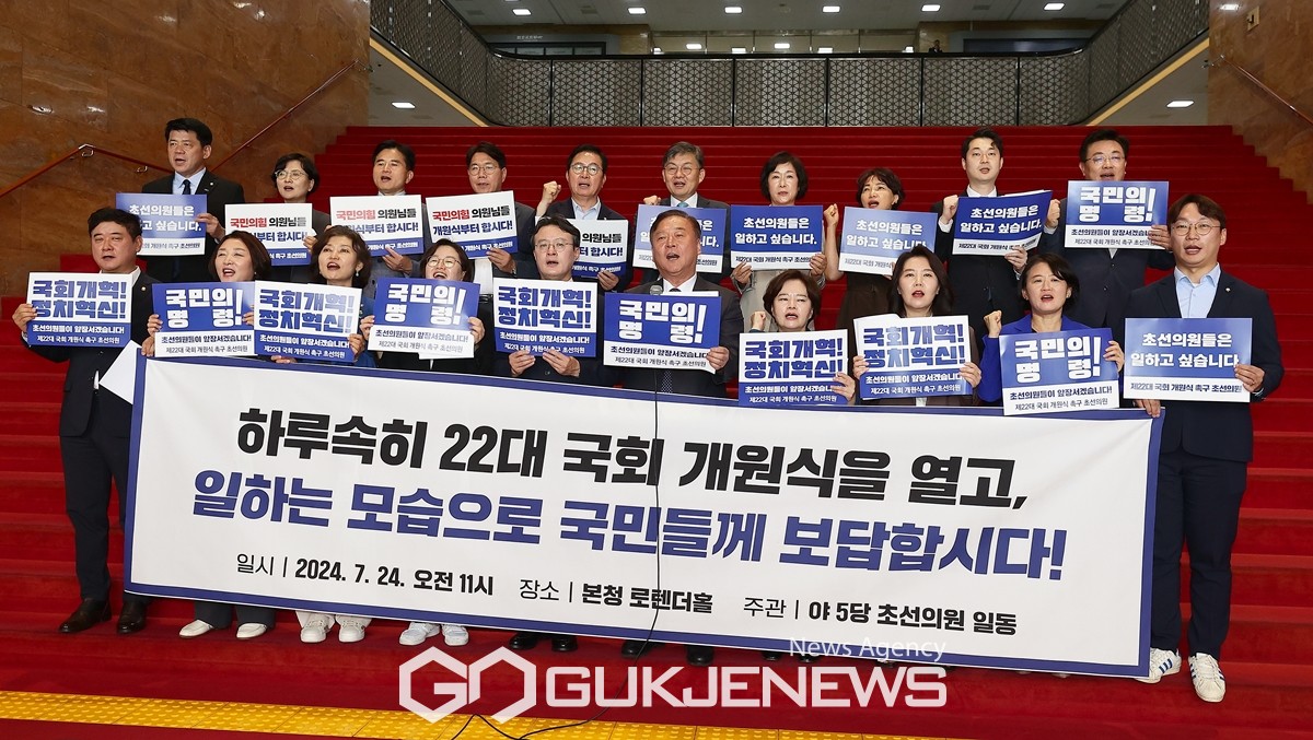 (서울=국제뉴스) 더불어민주당, 조국혁신당 등 야 4당 초선의원들이 24일 서울 여의도 국회 로텐더홀 계단에서 제22대 국회 개원식을 촉구하는 기자회견을 열고 있다. /사진=원명국 기자
