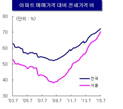 KB국민은행이 '2015년 7월 전국 아파트 매매 및 전세시장 동향'을 설문 조사한 결과, 전세가격 상승이 계속되면서 전국과 서울의 아파트 전세가격이 매매가격의 각각 72.2%, 70.3%인 것으로 24일 나타났다. 이는 지난 달보다 0.3%포인트, 0.7%포인트 상승한 수치다.