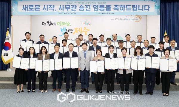 (제주=국제뉴스) 문서현 기자 = 제주도는 26일 제주도청 탐라홀에서 사무관 및 연구관 승진 의결자 32명(의회, 행정시 제외)에게 승진 임용장을 수여했다.