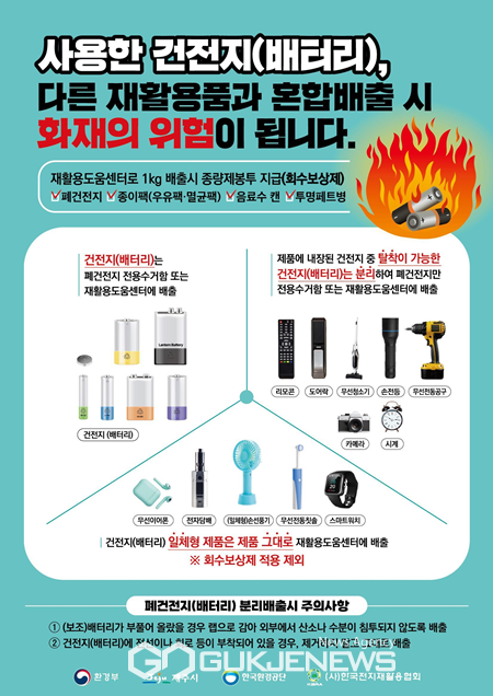 실제 다른 지역에서는 폐건전지 혼합배출로 수거차량에 화재가 발생하거나, 선별장에서 중장비(포크레인)가 리튬전지가 내장된 소형 가전을 밟아 폭발 및 화재 사고로 이어진 사례가 있다.