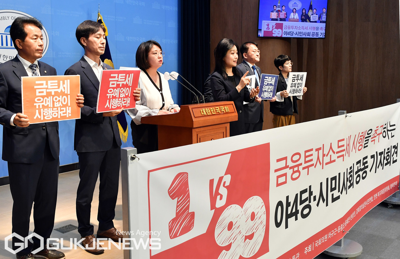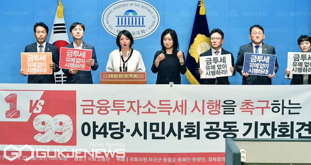 (서울=국제뉴스) 용혜인 기본소득당 대표가 23일 오전 서울 여의도 국회 소통관에서 열린 금융투자소득세 시행 촉구 야4당-시민사회 기자회견에서 발언을 하고 있다./사진=이용우기자