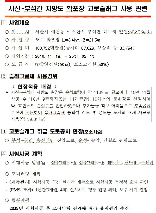 -충청남도 건설본부, 2023년 상반기 용역 완료... 고로슬래그 팽창으로 인한 파손 문제를 해결하기 위해 섬유 그리드와 샌드 매트를 이용한 시험 시공 계획