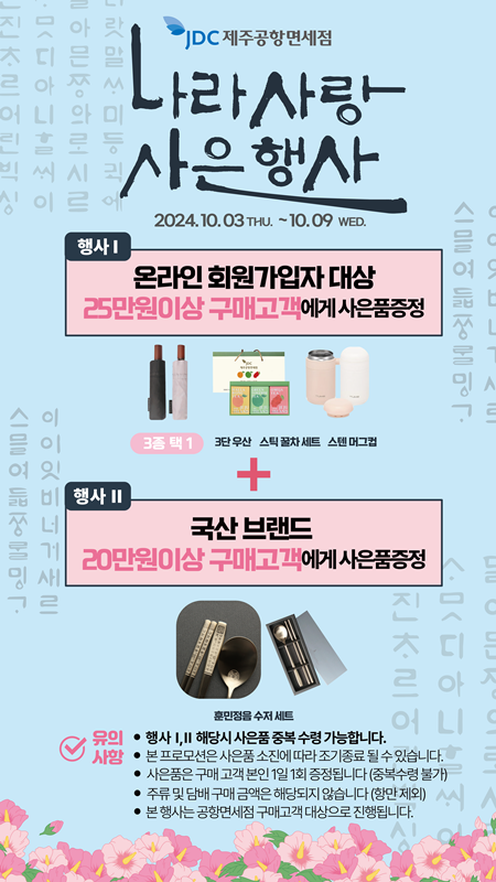 (제주=국제뉴스) 문서현 기자 =제주국제자유도개발센터(이사장 양영철, JDC)에서 운영하는 JDC면세점이 개천절과 한글날 연휴를 맞아 ‘나라사랑 사은행사’를 진행한다.