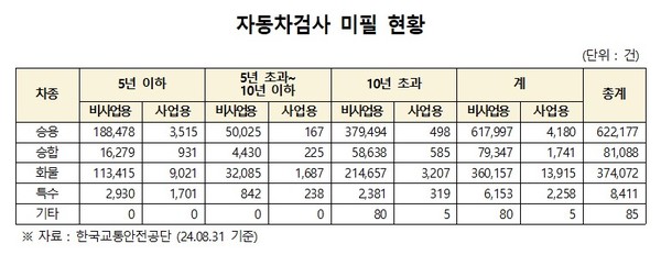 국회 국토교통위원회 소속 더불어민주당 손명수 의원이 한국교통안전공단으로부터 제출받은 ‘자동차 검사 장기 미이행현황’ 자료에 따르면 2024년 8월말 기준 ▴10년 초과 자동차 검사 미이행 차량 총 659,864대 ▴5년 초과~10년 이하 총 89,699대 ▴5년 이하 총 336,270대에 달했다.