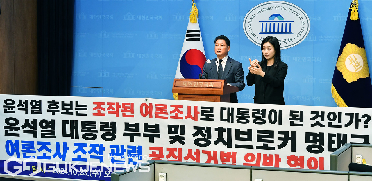 (서울=국제뉴스) 사법정의바로세우기 김함메 상임대표가 23일 오후 국회 소통관에서 20대 대선 여론조사 조작관련,윤석열 대통령부부 및 정치브로커 명태균씨를 공직선거법 위반 검찰고발 기자회견을 하고 있다./사진=이용우기자