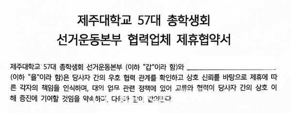 그러나 문제는 제57대 총학생회장에 출마한 A 후보는 공식선거운동기간이 아닌 5월부터 '선거운동본부'. '대표자'라는 특정 단어를 사용해 도내 업체들과 제휴 협약서를 체결했다는 것이다.