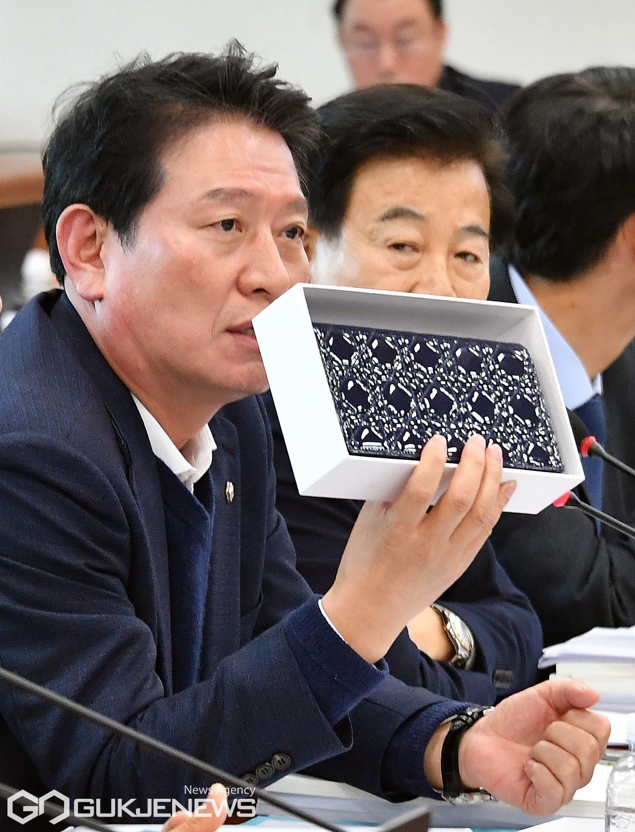 (서울=국제뉴스) 18일 오전 서울 여의도 국회 과학기술정보방송통신위원회에서 열린 박장범 한국방송공사(KBS) 사장 후보자 인사청문회에서 정동영 더불어민주당 의원 등이 조인철 의원이 박 후보자가 윤석열 대통령과의 신년대담을 진행하면서 김건희 여사가 받은 명품백을 파우치로 표현한 것에 대한 질의를 하기 위해 준비한 명품백을 보고 있다./사진=이용우기자